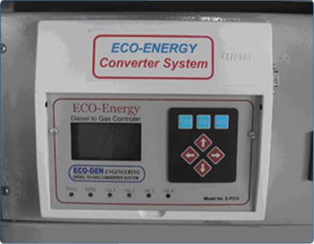 Technology: The Eco-Energys Bi-Fuel (dual fuel) system is based on a fumigation principle first observed by Mr. Rudolph Diesel, the inventor of the Diesel engine. Natural Gas enters with normal combustion air through the air filter, before the turbo charger. A significantly reduced amount of diesel fuel continues into the engine, which serves as a pilot ignition source for the natural gas. Our control system maintains the proper balance of natural gas, diesel and air to meet the engine’s BTU power requirements.